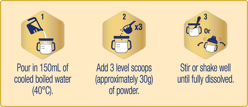 To prepare a single serving, add 3 level scoops (approximately 30g) of Enfagrow A+ Pro Stage 3 powder into 150ml of cooled boiled water (40’c) to make a 170ml beverage. Stir or shake well until the powder is fully dissolved.